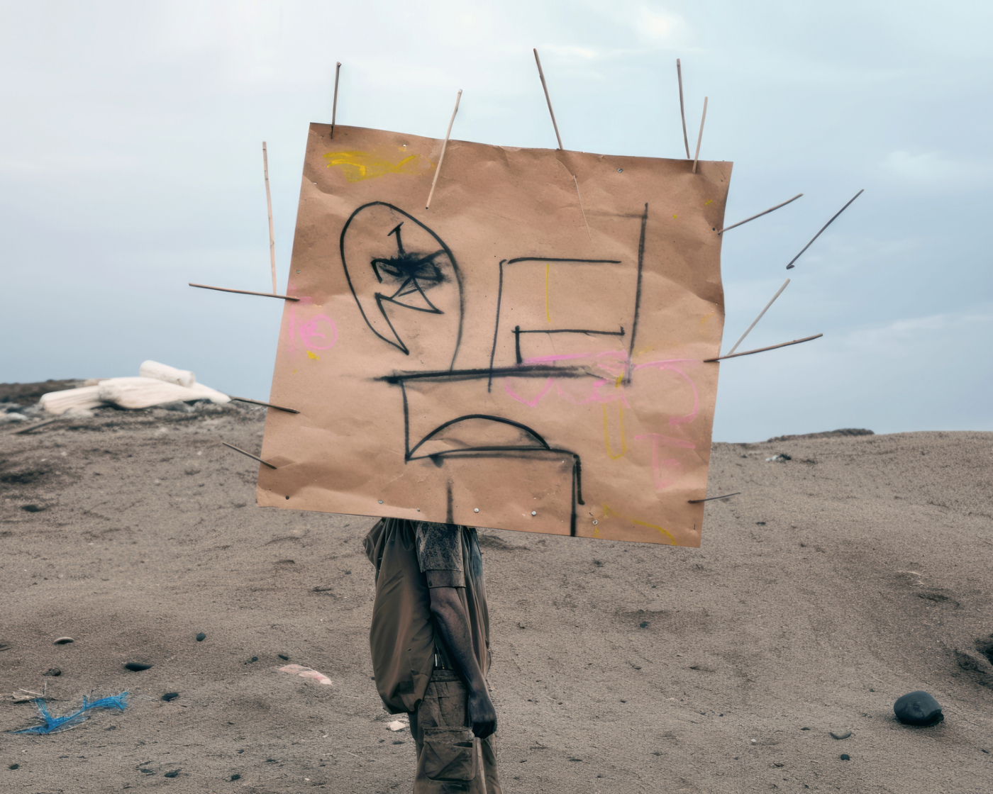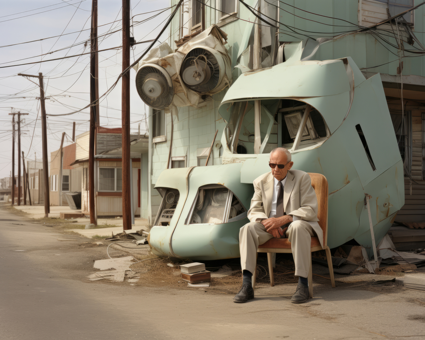 C’est le cas d’Éric Tabuchi, photographe explorant depuis vingt ans les formes architecturales. Dans The Third Atlas, il expérimente Midjourney pour produire des formes inédites, tapant parfois des lettres aléatoires ou des acronymes impossibles à matérialiser. Les résultats, imprévisibles, échappent à toute logique rationnelle : un prompt présentant les lettres « LIE » fait apparaître des personnages masqués comme traductions de l’idée de mensonge ; des panneaux couverts de signes abstraits émergent là où un message chargé de sens était attendu, révélant les limites d’un outil qui incapable d’écrire. Il transforme ainsi l’IA en instrument créatif autonome, libérant le photographe de la tutelle du réel pour le transformer en romancier d’espaces ; en curateur de formes et de situations.