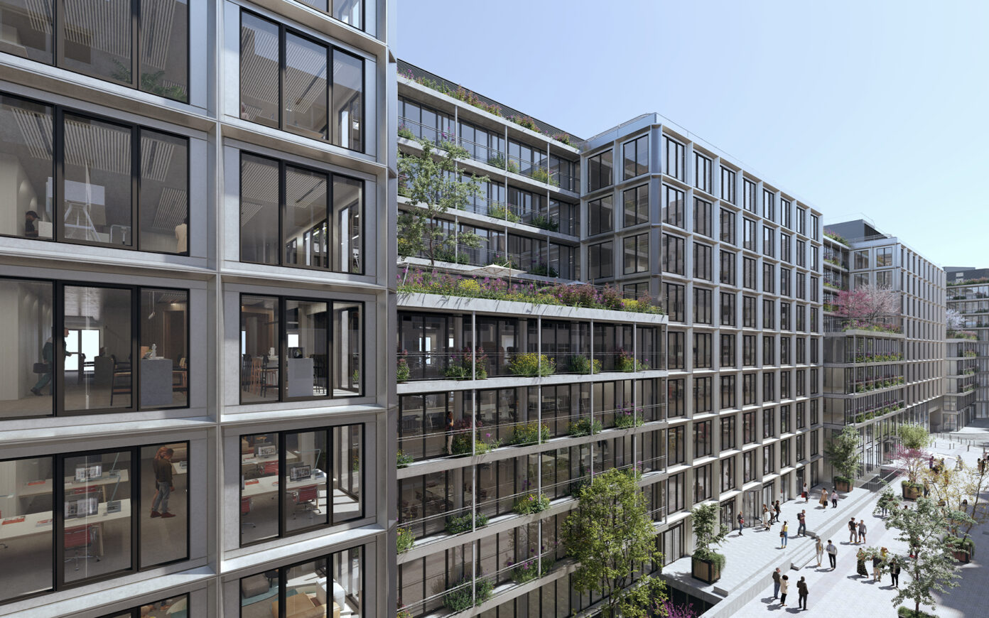 360 a été conçu pour rompre avec la logique du zoning fonctionnaliste et s’inscrire dans une urbanité vivante. La réimplantation des halls d’accueil a libéré des espaces commerciaux dans le socle, destinés aux usagers et aux habitants du quartier : boulangerie, bar à salade, atelier de réparation vélo, coworking… Au sud, la façade offre de larges ouvertures vitrées et s’inscrit de façon plus qualitative dans son environnement, avec des extensions assurant une continuité du socle et une végétalisation formant un paysage vertical. L’ancien RIE est rendu à l’espace public et végétalisé, embellissant l’allée piétonne par un parvis d’entrée du bâtiment. Au nord, les rampes de parking sont réduites pour libérer un maximum d’espace public. L’ouverture du bâtiment sur ses deux expositions anticipe la requalification de la contre-allée mais aussi la pacification du Périphérique.