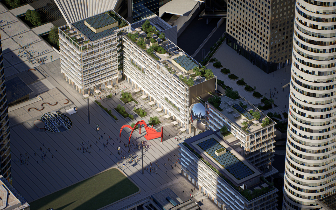 La durabilité et la dimension exemplaire de notre approche reposent principalement sur la décision de procéder à une rénovation avec un minimum de démolition du bâtiment, principalement de la façade, pour améliorer l’efficacité énergétique de l’enveloppe du bâtiment. Cela est complété par l’utilisation de matériaux et de techniques de construction à faible empreinte carbone. Étant donné que le bâtiment existant est très énergivore, une amélioration de ses performances est nécessaire pour réduire la consommation d’énergie. La végétalisation de la cour intérieure et des terrasses contribue également à améliorer le confort des usagers.