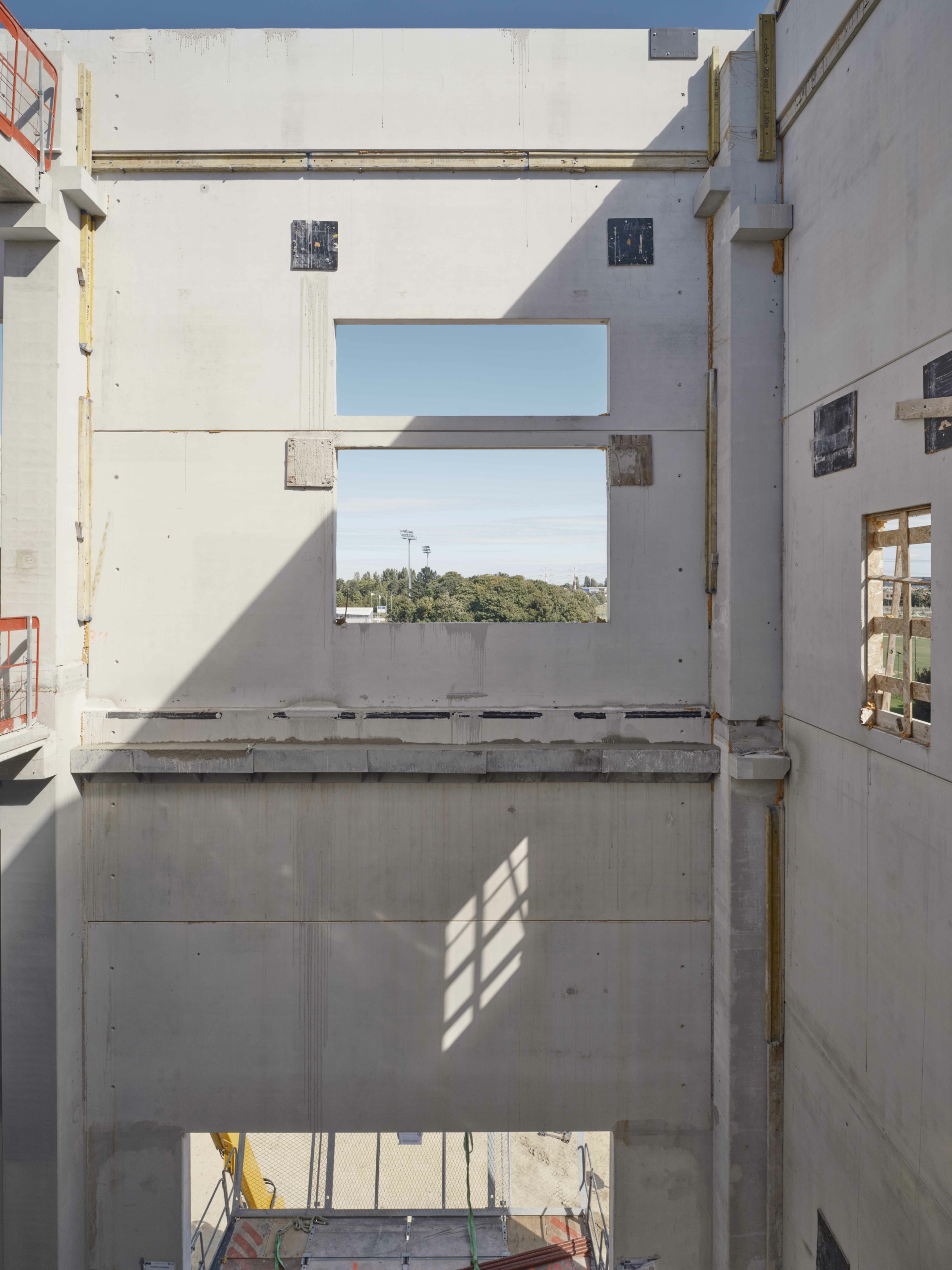 Deux ans de travail en dialogue avec les équipes des musées ont permis de concevoir un équipement optimisé pour offrir un outil de conservation de niveau international, compacté au maximum pour réduire toute surface inutile et économiser matières et budget. Le pôle de conservation sécurisé offre toutes les capacités et nature de stockage. Les réserves se développent sur trois niveaux, dont un dédié au musée Picasso, au fonctionnement indépendant. Les œuvres lourdes et volumineuses occupent le rez-de-chaussée, les plus légères les étages ; les ateliers se déploient aux niveaux deux et trois au nord du bâtiment. Le plateau d’expositions, avec son grill technique pour toute muséographie, surplombe les réserves et offre des vues exceptionnelles ; il est également connecté au plateau de parole et performance. Entre la partie publique et les ateliers, une vitre permet de découvrir les nouvelles acquisitions dans un espace ponctuellement visitable.