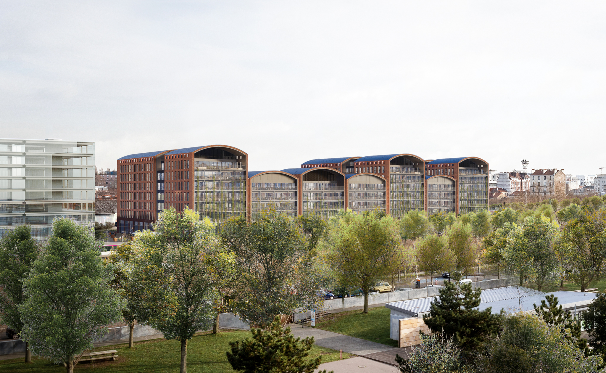 Ivry Confluences also capitalizes on the presence within its boundaries of the Halles Haber, a unique piece of industrial heritage. The project strives to make the most of these vast industrial halls, which attest to the efficiency and the rationality of construction in the railway sector, with their concrete arches spanning an impressive 18 meters. Though the pursuit of both density and maximizing open ground areas doesn’t allow keeping all the halls, the project nevertheless draws from the singular geometry of their convex roofs, as well as their original layout. In keeping with the preexisting construction design, Ivry Confluences thus retains the principle of a comb-shaped layout, perpendicular to Rue Molière and to the railway tracks, positioning volumes having the same width (18 meters) side by side, but with varied lengths and heights. High and low volumes therefore coexist, preserving the particular morphology of the district.