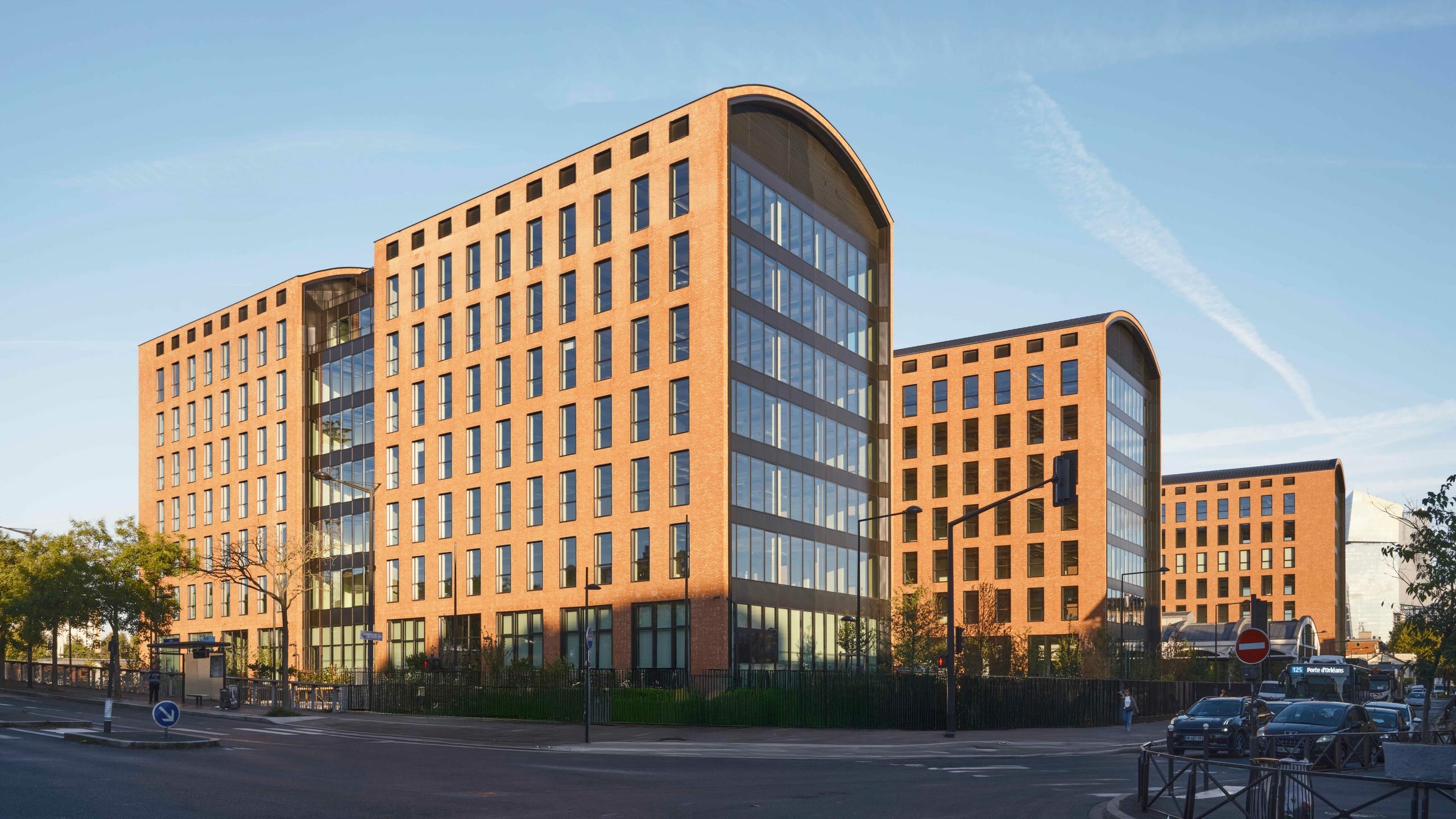 On the Rue Molière side, the composition offers a scenery of a succession of three green courtyards guiding users towards the entrances of the buildings. These courtyards dampen the perception of the density of the plot and are used for a variety of shared uses, with al fresco dining and urban workout furniture available. The succession of solids and voids lends a more dynamic touch to the silhouette of the complex as seen from the street, making it appear more like a succession of buildings of a restrained scale than as an imposing office complex.