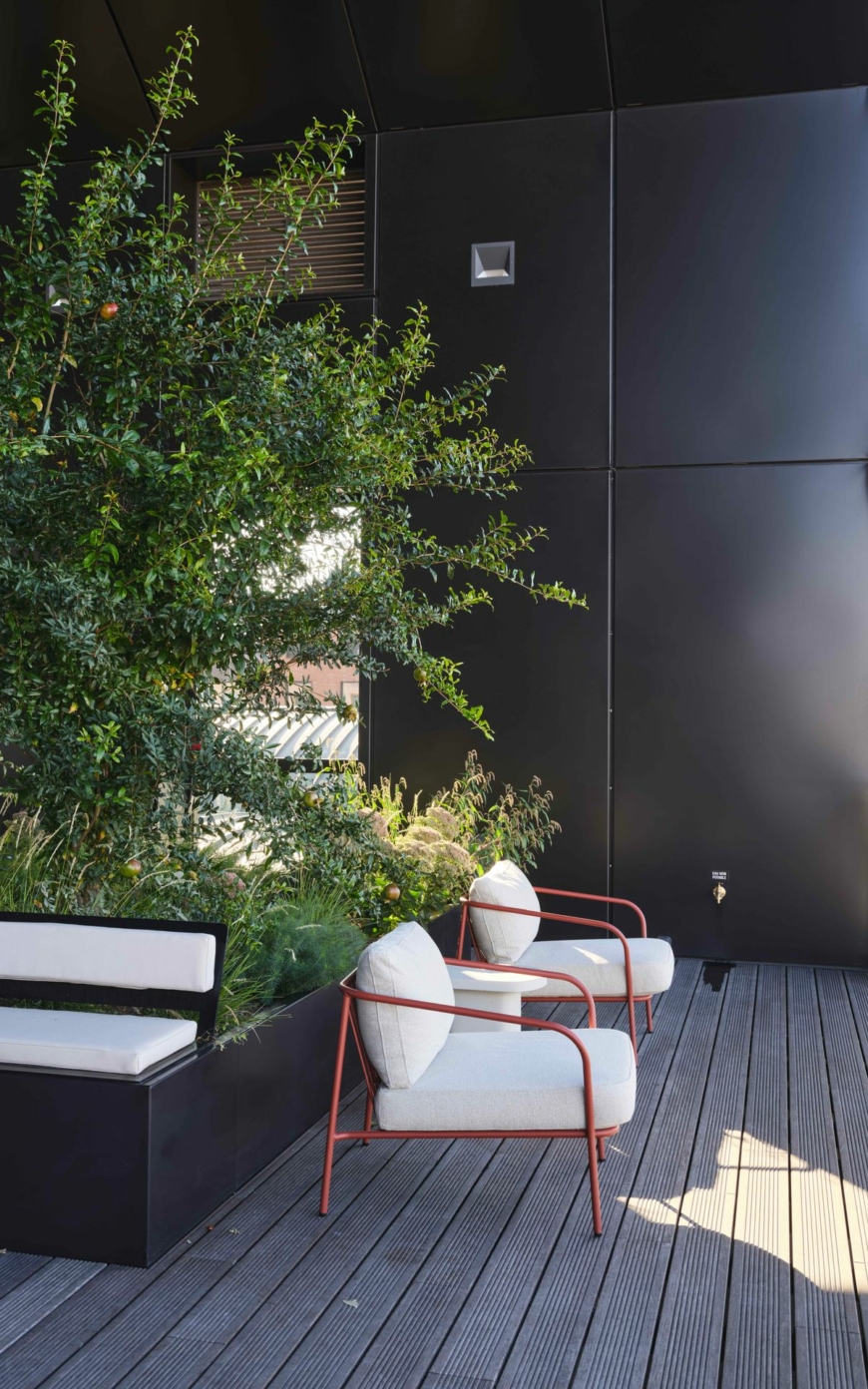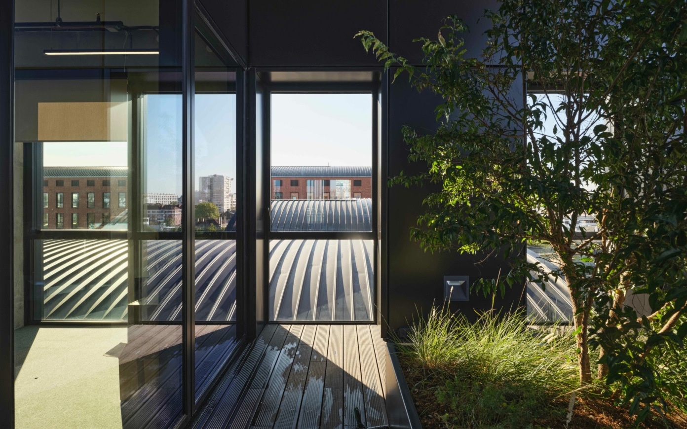 The close intertwining between architecture and plantation makes it possible to develop the greenery along several dimensions and at various heights—the southern façade is notably transformed into a green screen, while the terraces and roofs are turned into spaces for contemplation and breathing. Facing the sun, the southwest façade is sheltered by a persistent screen of plants, as the plantations on the ground floor run along the front of the buildings. On various stories, randomly distributed large planter boxes take over, giving rise to a veritable “green curtain” that is both lightweight and vibrant. These features improve comfort levels for the users of the building, while addressing their biophilia—the need for outdoor spaces and reconnection to nature, and a source of well-being. Ivry Confluences thus provides a variety of outdoor spaces on each story, including in the form of a small outdoor walkway, which enables employees to get a breath of fresh air without having to first go down to the ground floor. The greening of these walkways, when their orientation allows it, provides greater comfort levels in these spaces. The accessible rooftops are livened up with potted shrubs and offer a privileged vantage point of the city and the horizon. The non-accessible flat roofs are also planted. A fertile substrate will make it possible to plant a mix of species ranging from sedum to grasses and perennial alpine plants. These spaces, sheltered and secure, will become real havens for insects and birds.