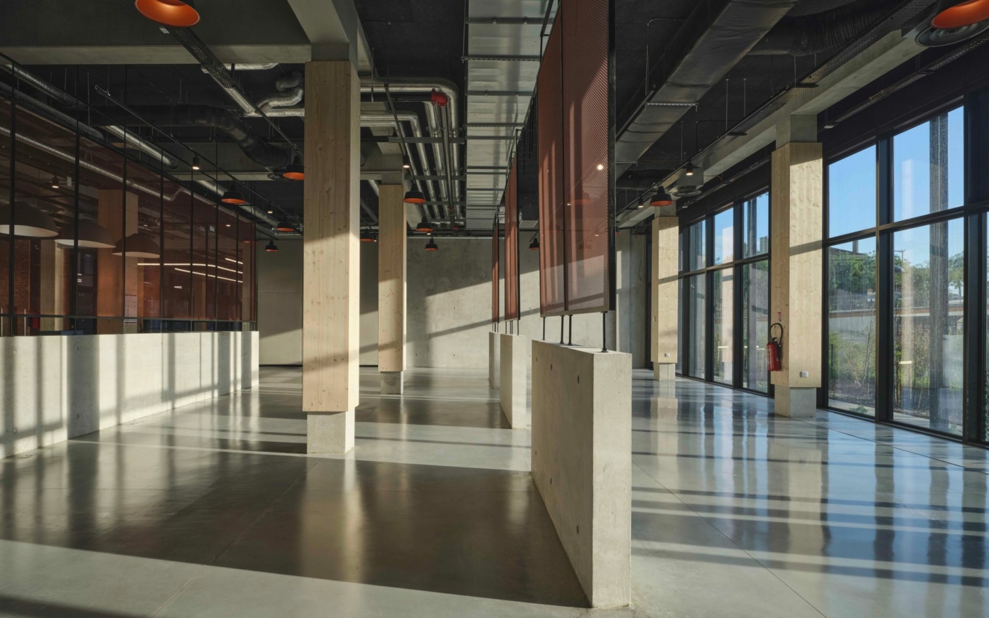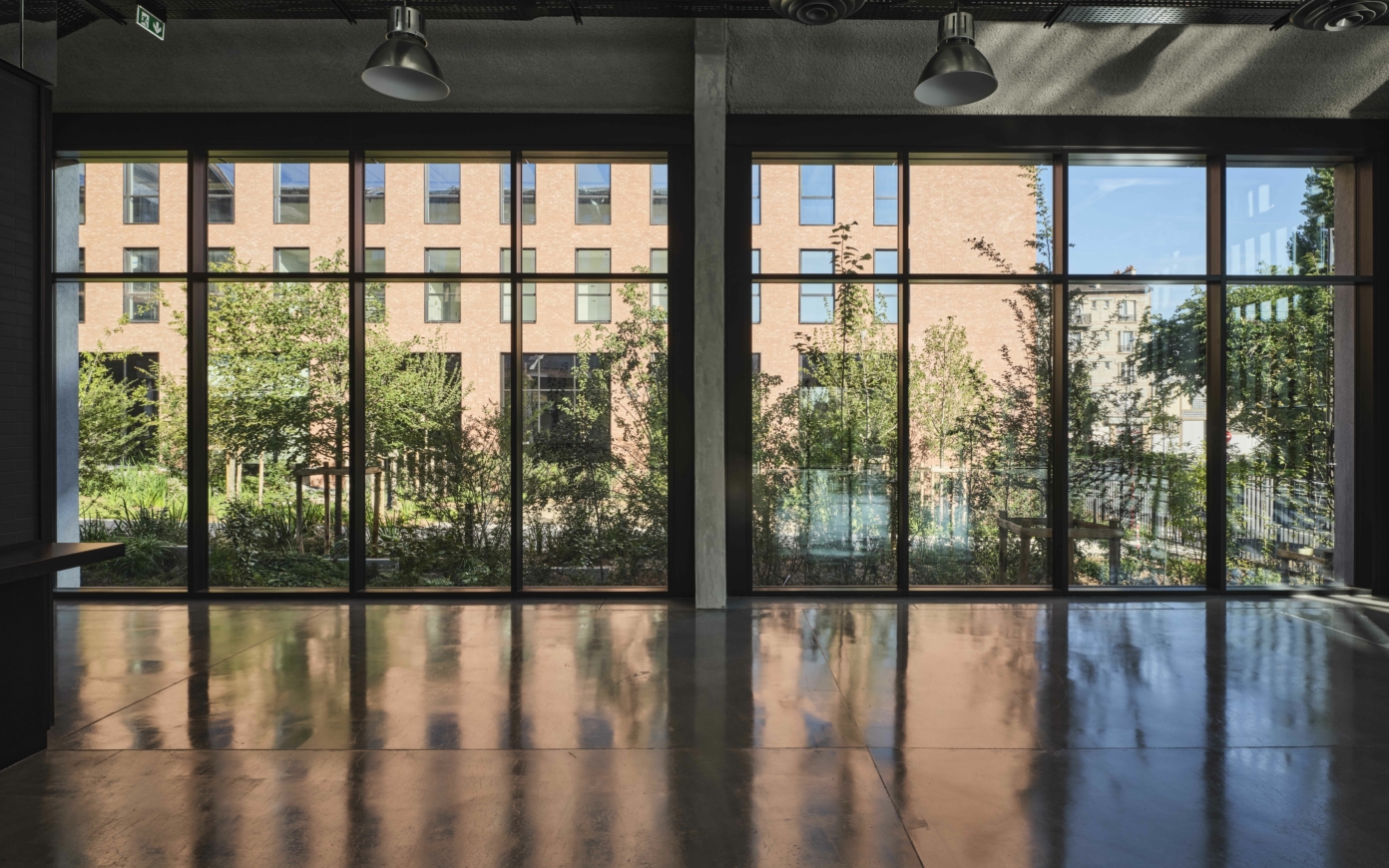 In order to meet the ecological ambitions of the district, Ivry Confluences develops an environmental strategy based on a large number of features which holistically come together to bolster the exemplary character of the complex. In addition to enabling dialogue with the city’s architectural heritage, the decision regarding the materiality of the façades, with the use of fired clay bricks, asserts the choice of a timeless and low-embodied-carbon material. Each of the buildings also rests on infrastructure made of low-carbon concrete (made necessary due to flood protection constraints), on top of which a structure made entirely out of wood is erected, including posts, beams, and floors. Adapted reuse is applied throughout construction, along with a large-scale use of bio-based materials—a reclaimed raised floor, blackout blinds made of recycled textiles, seaweed paint, etc.