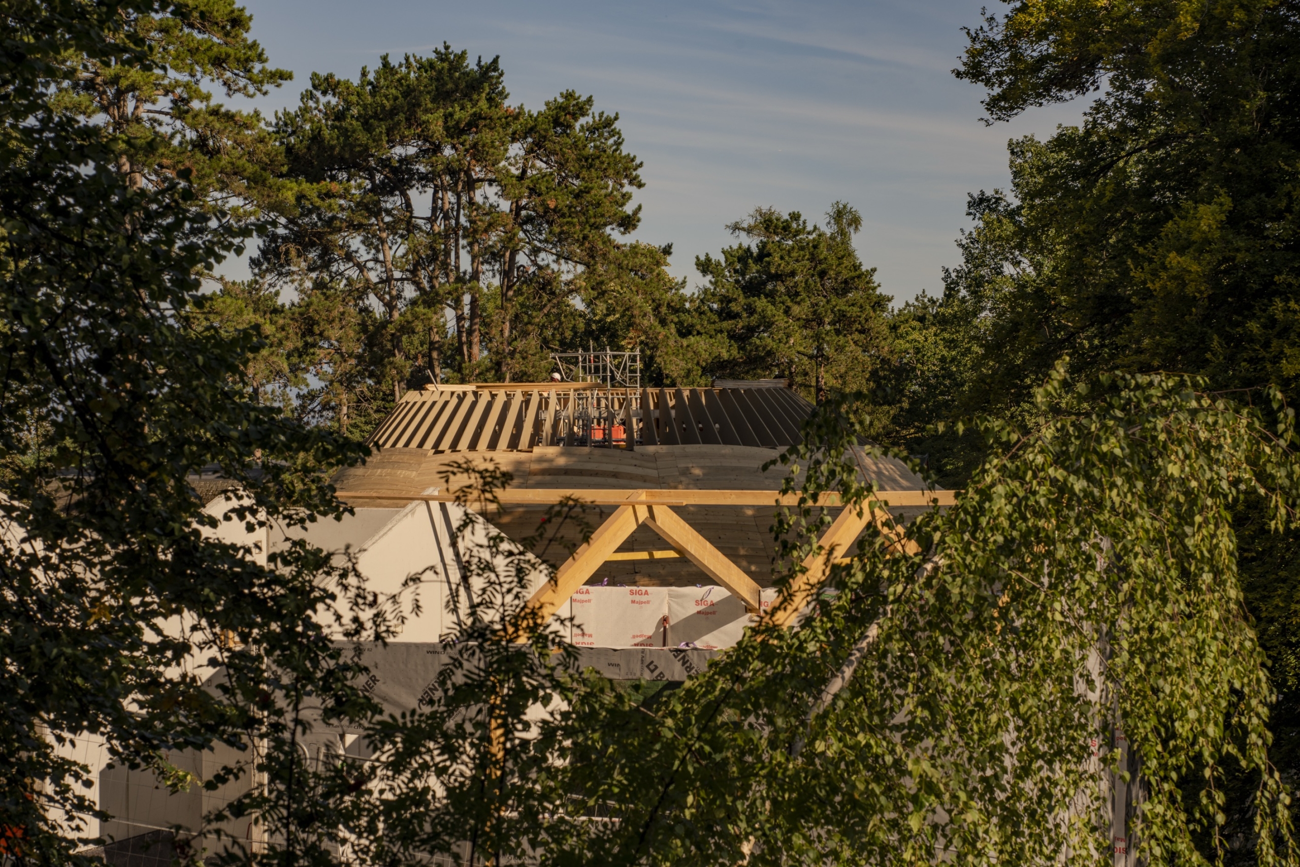 Structurally, La Source Vive is layered like an onion. A concrete base hosts tiered seating and is topped with a concrete acoustic hull that is covered in textured plaster, followed by a void, and then a timber structure supporting a copper-coated outer shell. A full range of seating that is both varied and specific to La Source Vive will be developed, bolstering the unique character of the place.