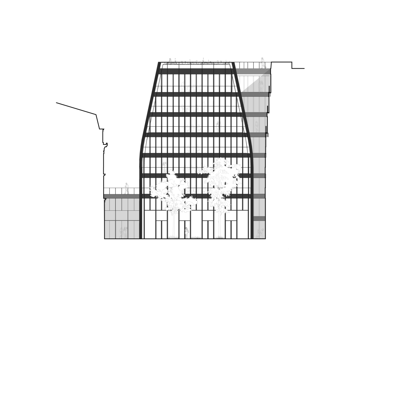 In the center of the courtyard, a brand new pavilion has been added: the “NoPa”. The pavilion’s volumetric aspects pay homage to its vanished predecessor. It connects the historic and modern buildings via a spectacular double-height hallway, while also providing harmony to the layout. Two courtyards of better proportions are thus created: one mineral and intended as a service entrance – emergency services, deliveries – the other vegetal and intended for the occupants, organized around an exquisite garden.
