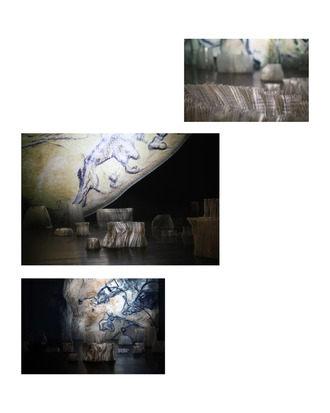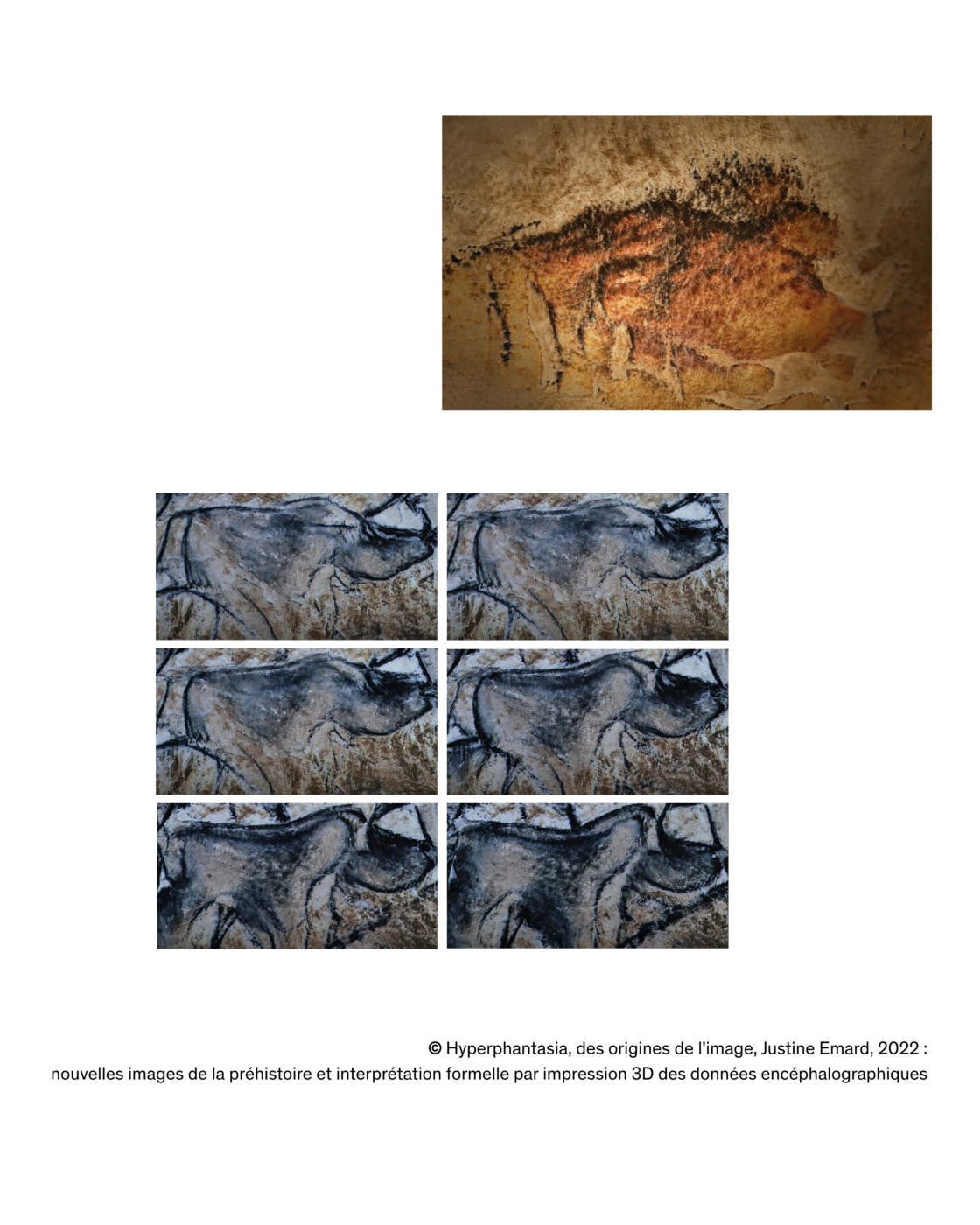 Pour Justine Emard, la maîtrise d’une œuvre fondée sur l’IA suppose une connaissance fine de sa base de données, voire sa constitution par l’artiste elle-même, dans une démarche qui rapproche l’art de la méthode scientifique. Avec Hyperphantasia, elle interroge l’origine des images, depuis leur formation mentale dans le cortex visuel jusqu’aux premières inscriptions pariétales des grottes ornées. Cherchant à travailler sur l’idée de « premières bases de données », elle collabore avec l’Observatoire de l’espace du Centre national d’études spatiales pour enregistrer l’activité corticale d’astronautes durant leur sommeil, tout en accédant aux relevés numériques de la grotte Chauvet. Ces traces primordiales, griffures, empreintes, pigments soufflés, deviennent, avec les informations neuronales, la base de donnée mobilisée par la machine pour dessiner de nouvelles formes, restituant une atmosphère plus qu’une image, une expérience plutôt qu’une reproduction.
