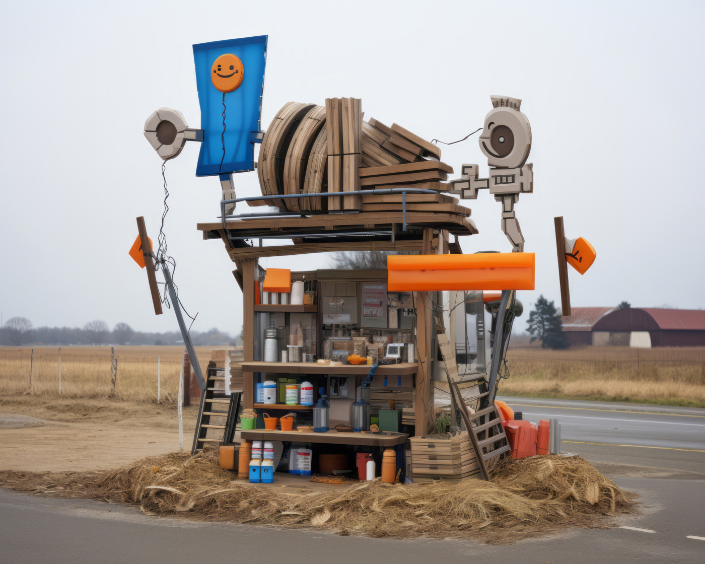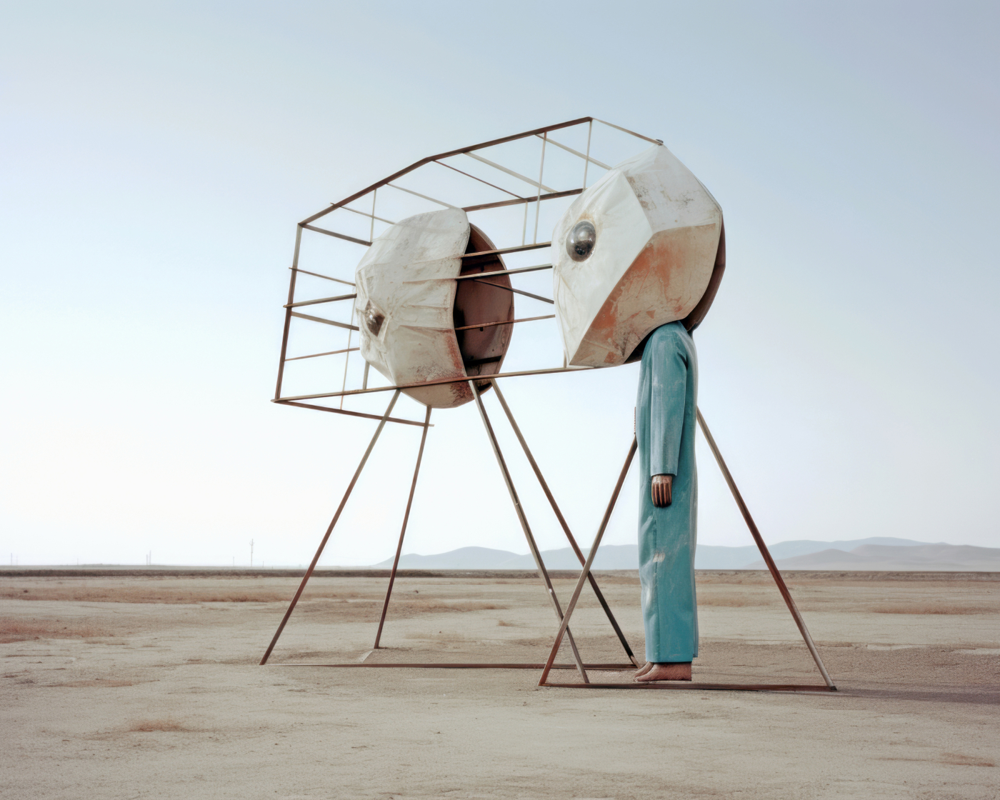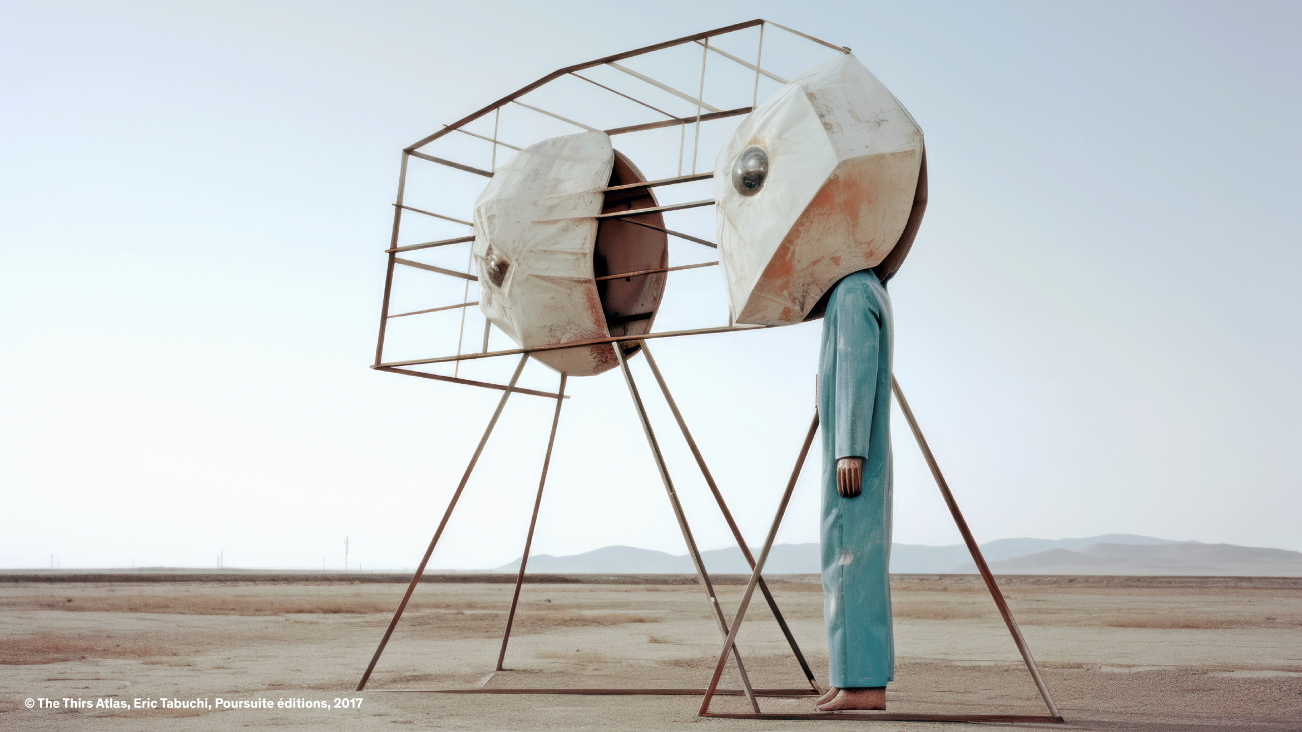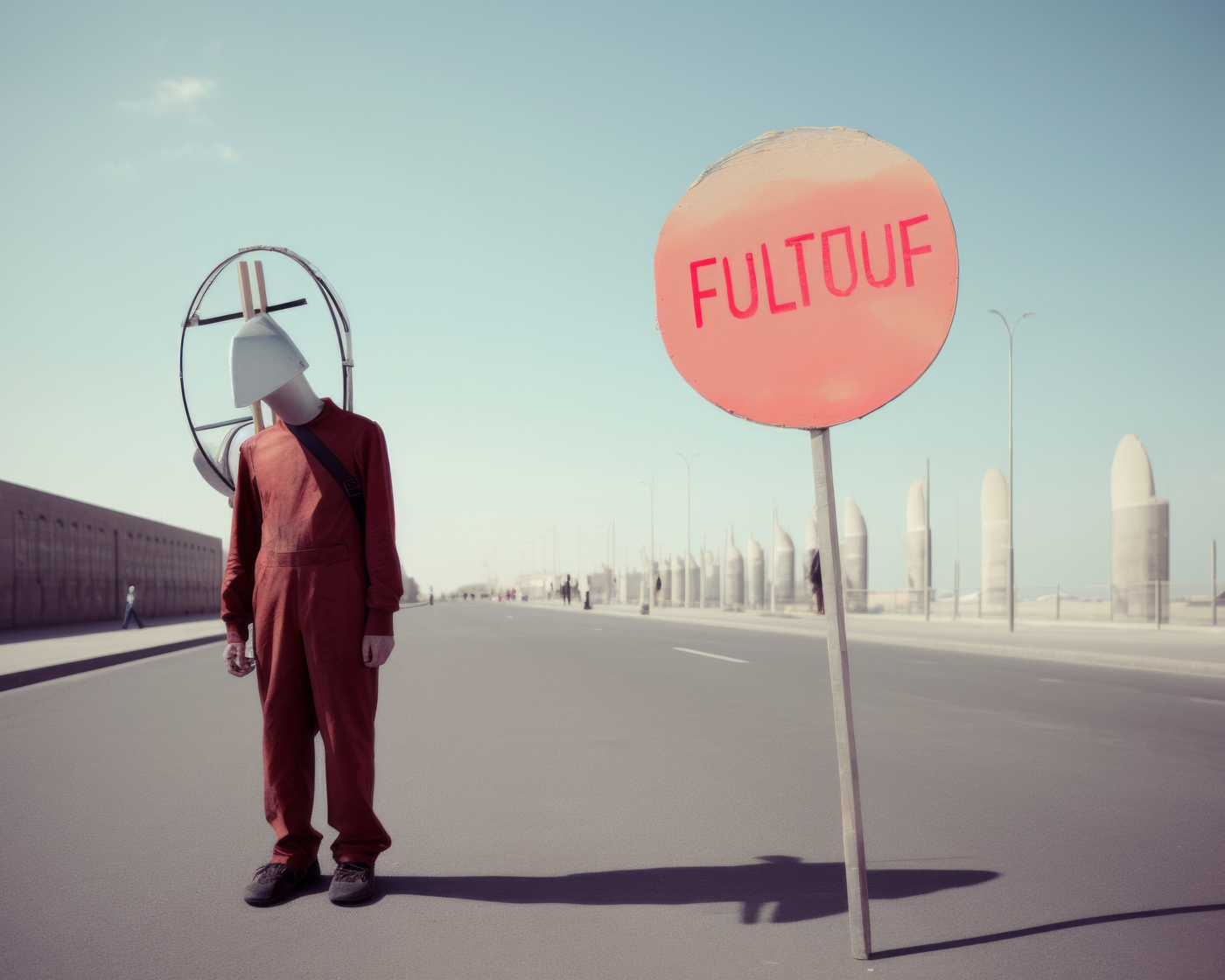 C’est le cas d’Éric Tabuchi, photographe explorant depuis vingt ans les formes architecturales. Dans The Third Atlas, il expérimente Midjourney pour produire des formes inédites, tapant parfois des lettres aléatoires ou des acronymes impossibles à matérialiser. Les résultats, imprévisibles, échappent à toute logique rationnelle : un prompt présentant les lettres « LIE » fait apparaître des personnages masqués comme traductions de l’idée de mensonge ; des panneaux couverts de signes abstraits émergent là où un message chargé de sens était attendu, révélant les limites d’un outil qui incapable d’écrire. Il transforme ainsi l’IA en instrument créatif autonome, libérant le photographe de la tutelle du réel pour le transformer en romancier d’espaces ; en curateur de formes et de situations.