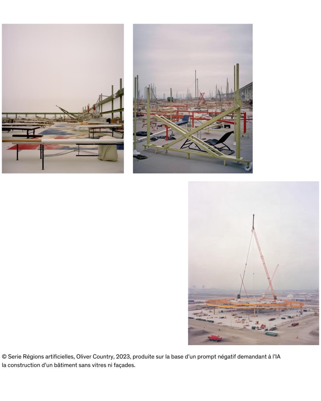 Olivier Campagne, perspectiviste et créateur d’images digitales, a passé dix-sept ans chez ArteFactory avant de développer une pratique indépendante sous deux signatures : son nom, pour des commandes institutionnelles en architecture et Oliver Country, pour des expérimentations esthétiques hyperréalistes. Il travaille avec Stable Diffusion, modèle ouvert qu’il entraîne lui-même afin d’affiner des esthétiques ciblées. Avec l’accord du photographe Rory Gardiner, il a constitué un jeu d’apprentissage à partir de plusieurs centaines de ses images, non pour en reproduire l’écriture, mais pour explorer des rendus et des qualités de lumière distincts de ceux habituellement générés par les IA et orienter l’outil vers une expression plus personnelle.