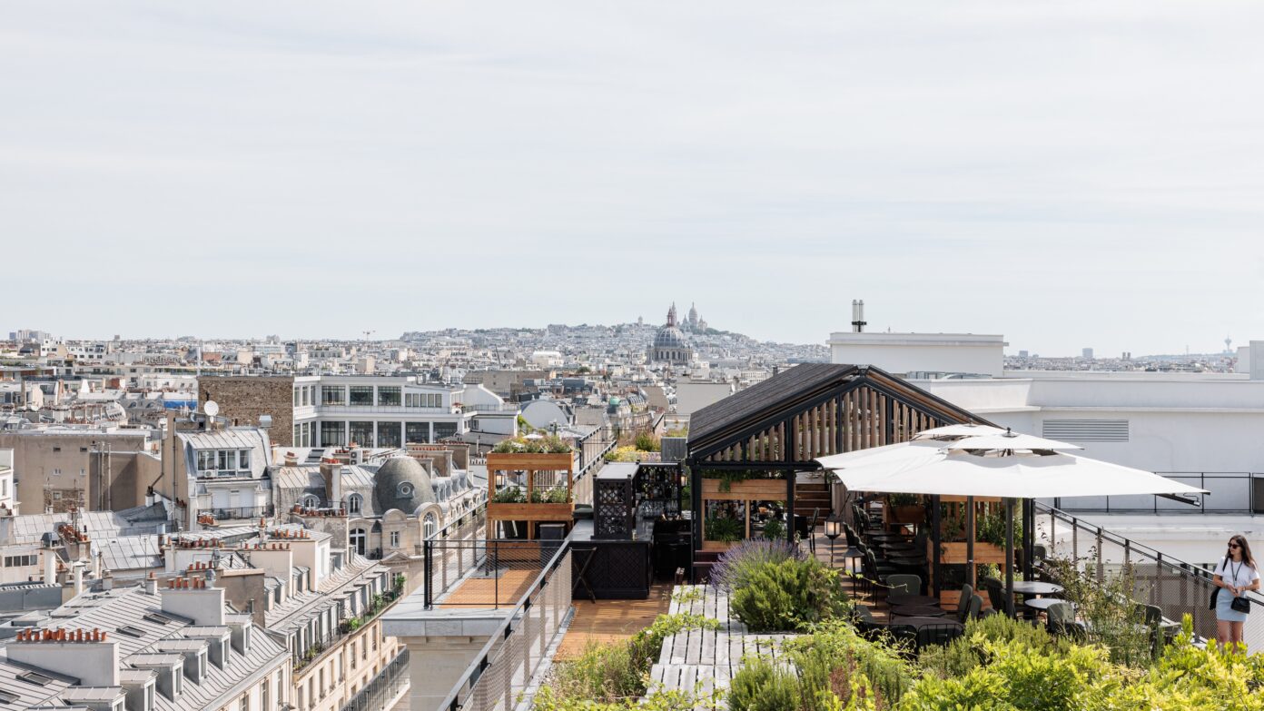 Les espaces extérieurs du 52 Champs sont magnifiés, rouvert au public et végétalisés. Ils participent au bien-être des utilisateurs tout en renforçant l’écosystème général. Les terrasses étaient encombrées d’éléments techniques inutilisés qui sont supprimés, déplacés ou masqués par les aménagements paysagers. De larges espaces sont dégagés pour créer un jardin suspendu. Son parcours bucolique alterne prairies fleuries, parterres d’aromatiques et zones arbustives. Le pavillon à coupoles est rénové et complété par une intervention contemporaine. Au sortir de la promenade champêtre, le visiteur découvre un rooftop bar aux vues exceptionnelles. Un luxueux restaurant occupe la suite de la terrasse, où une serre est aménagée pour des réceptions exclusives. Ces espaces rares contribuent à l’identité et l’image du 52 Champs.