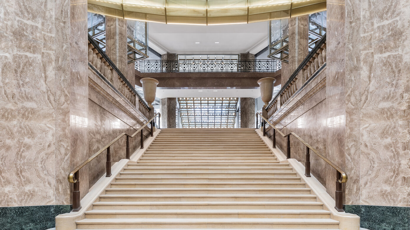 La restructuration redistribue les espaces par un nouveau cheminement, mis en valeur par une écriture contemporaine. PCA-STREAM souligne les éléments qui ont perduré et redéfinit ceux dont la lisibilité a été affaiblie. Parmi les éléments patrimoniaux remis en valeur, l’escalier d’honneur et les décors intérieurs de la National City Bank, avec ses vases monumentaux, appliques à palmettes, balustres, habillages de marbre ou boiseries de Jacques-Émile Ruhlman.