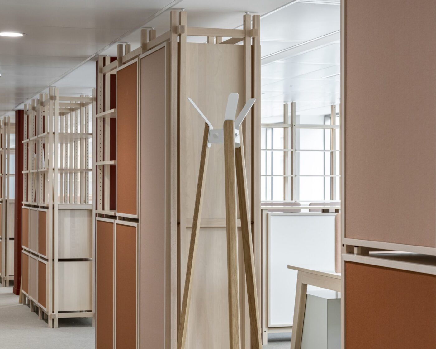 Au sein des bureaux, un système constructif sur-mesure est imaginé pour équiper, organiser et délimiter les espaces. Ce système modulaire est aisément recomposable, évoluant avec les besoins des usagers. Il est réalisé en bois massif issu de forêts françaises et fabriqué en France.
