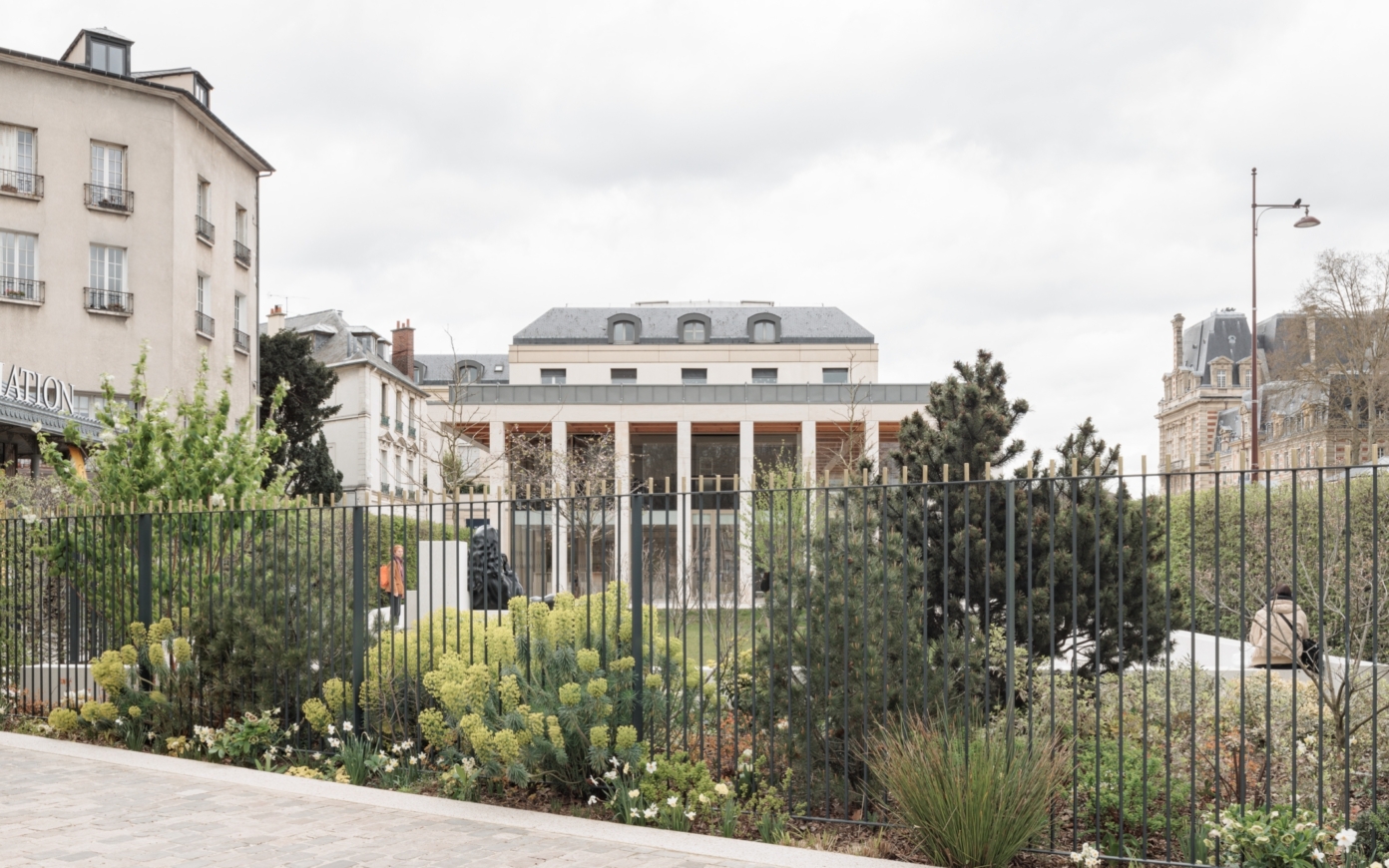 Le bâtiment dialogue avec une création du paysagiste Nicolas Gilsoul, qui a réinterprété la figure bosquet, ces petits jardins clos souvent ornés d’une œuvre d’art, avec ici une sculpture de Molière par Xavier Veilhan.